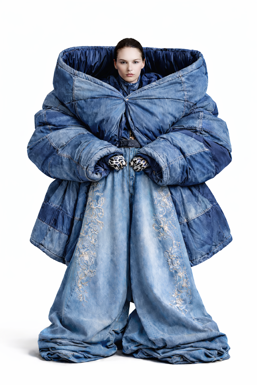 Matière populaire par excellence, le denim traverse les époques, les genres et les classes. Chargé d’histoires collectives, de luttes, de cultures urbaines et d’appropriations successives, il devient ici le vecteur d’une transformation corporelle et identitaire. Le vêtement n’habille plus seulement le corps : il le modifie, le prolonge, le questionne.